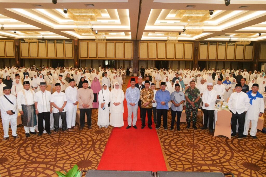WAGUB Marlin dan Wali Kota Batam H Muhammad Rudi (HMR), doa bersama di acara pelatihan manasik dan pelepasan Jemaah Calon Haji (JCH) Kota Batam 1444 H/2023 M, di Swissbel Hotel Harbour Bay, Sabtu (20/5/2023).
