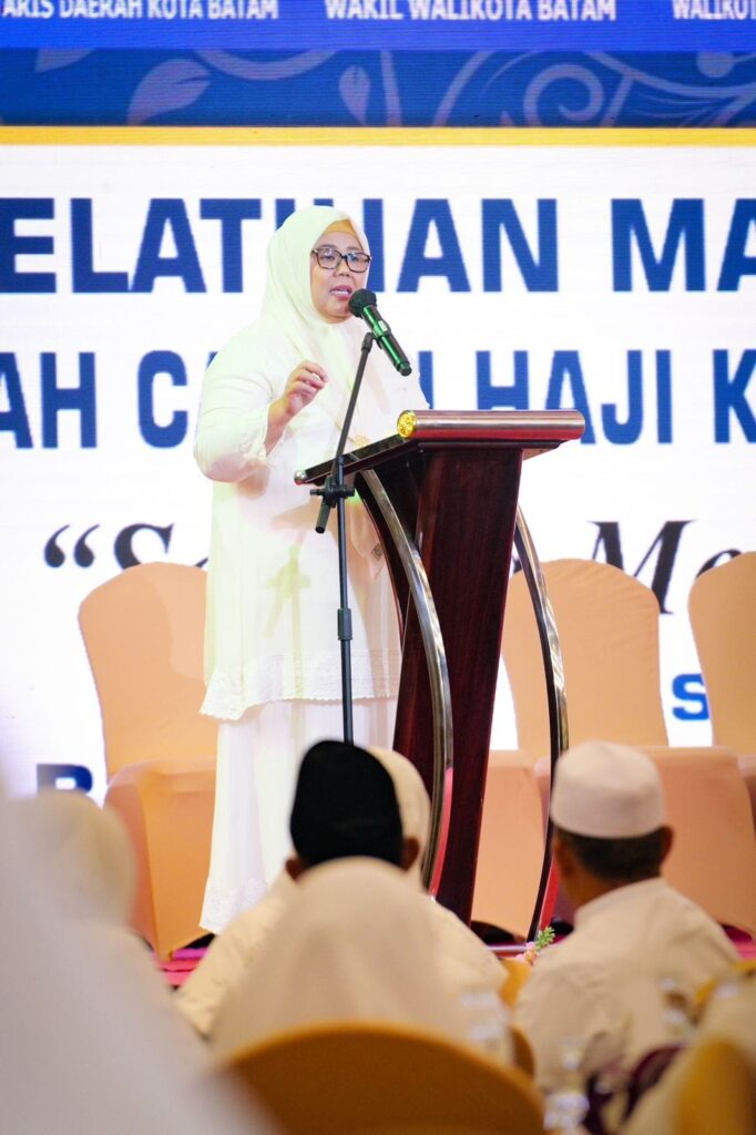 BATAMCENTRE, KataBatam- Wakil Gubernur Kepulauan Riau Hj Marlin Agustina, mendampingi Wali Kota Batam H Muhammad Rudi (HMR) di acara pelatihan manasik dan pelepasan Jemaah Calon Haji (JCH) Kota Batam 1444 H/2023 M, di Swissbel Hotel Harbour Bay, Sabtu (20/5/2023).