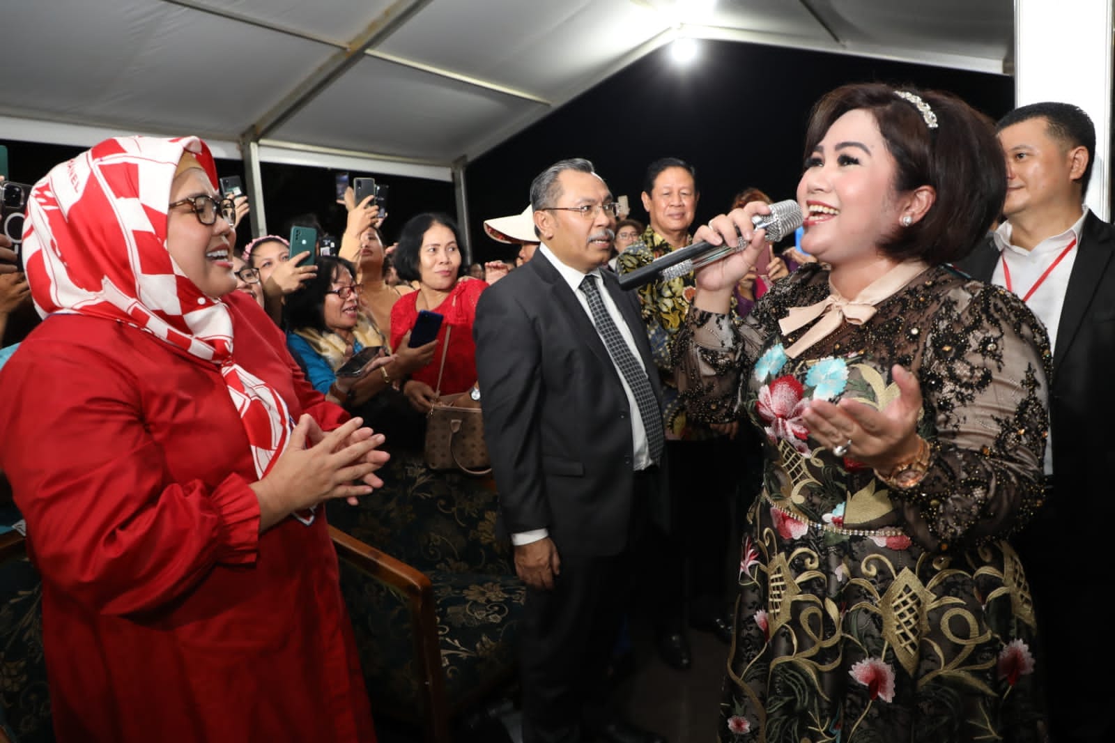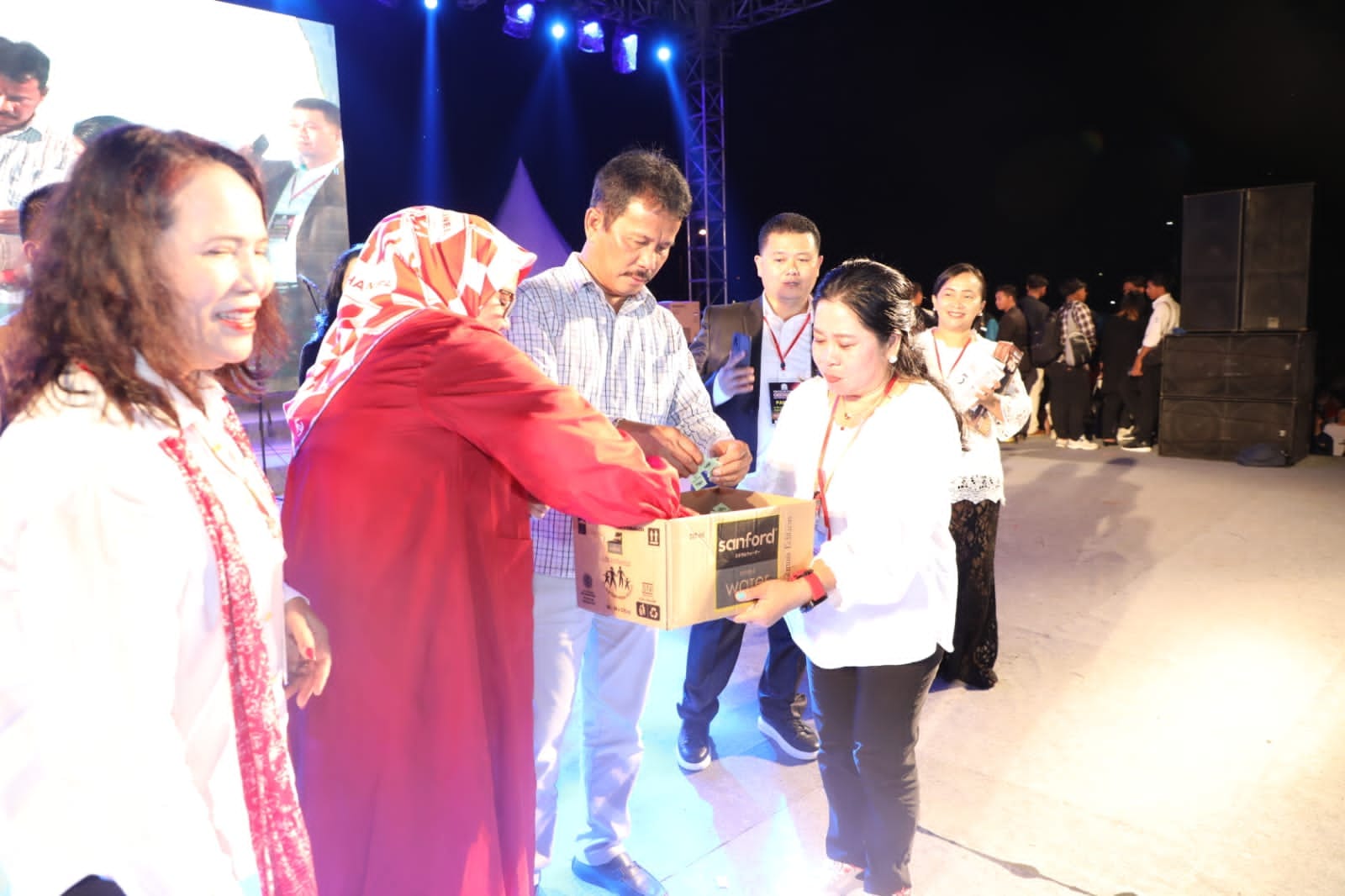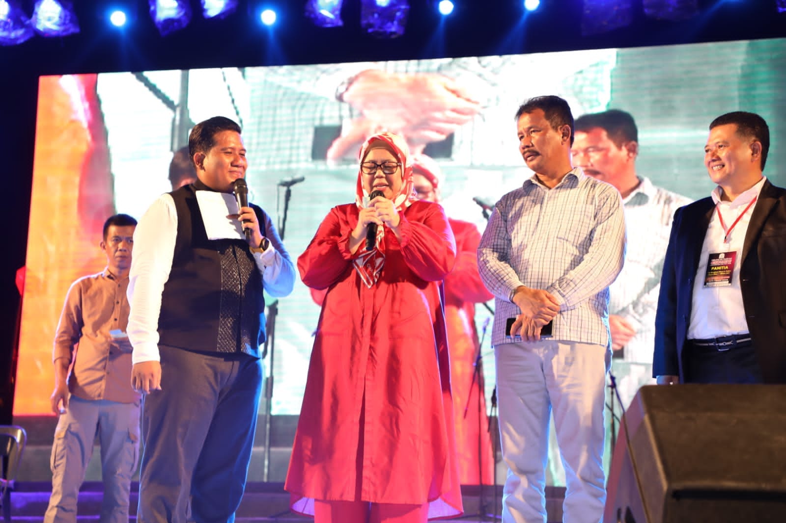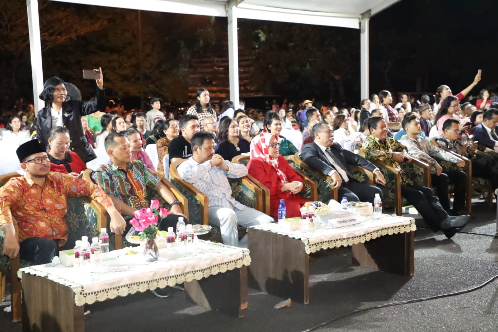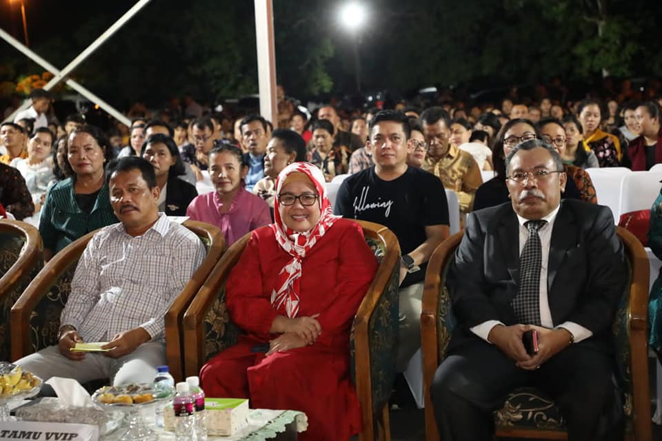 WAGUB Marlin, menyaksikan artis Joy Tobing menyanyikan lagu pop “Semua Karena Cinta”, saat menghadiri Paskah Oikumene se-Kota Batam, di Stadion Temenggung Abul Jamal, Mukakuning, Sabtu (13/5/2023) malam.