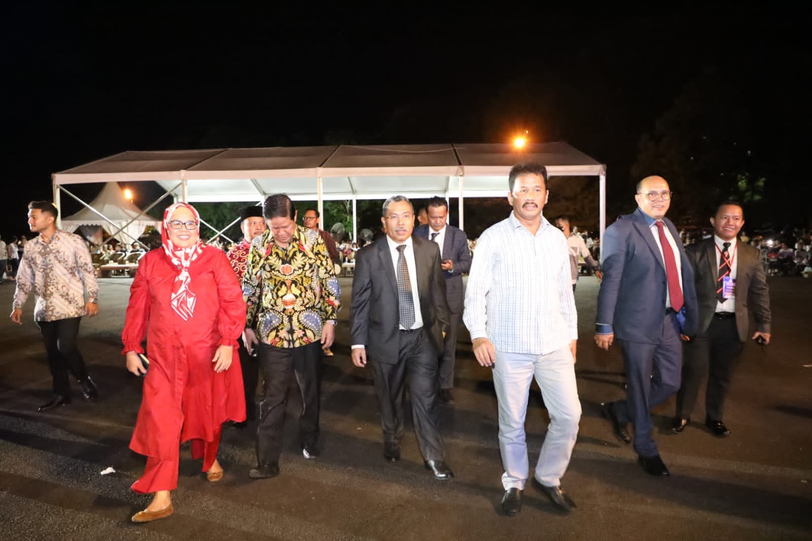 WAGUB Marlin, bersama Wali Kota Batam/Kepala BP Batam H Muhammad Rudi (HMR), dan Ketua Panitia Onward Siahaan, tiba di lokasi Paskah Oikumene se-Kota Batam, Stadion Temenggung Abul Jamal, Mukakuning, Sabtu (13/5/2023) malam.