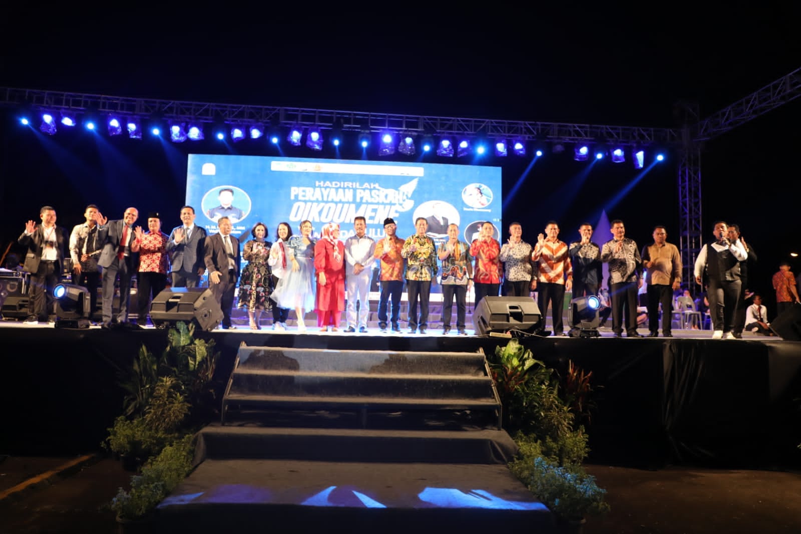 WAGUB Marlin, bersama Wali Kota Batam/Kepala BP Batam H Muhammad Rudi (HMR), foto bersama di sela menghadiri Paskah Oikumene Se-Kota Batam, di Stadion Temenggung Abul Jamal, Mukakuning, Sabtu (13/5/2023) malam.