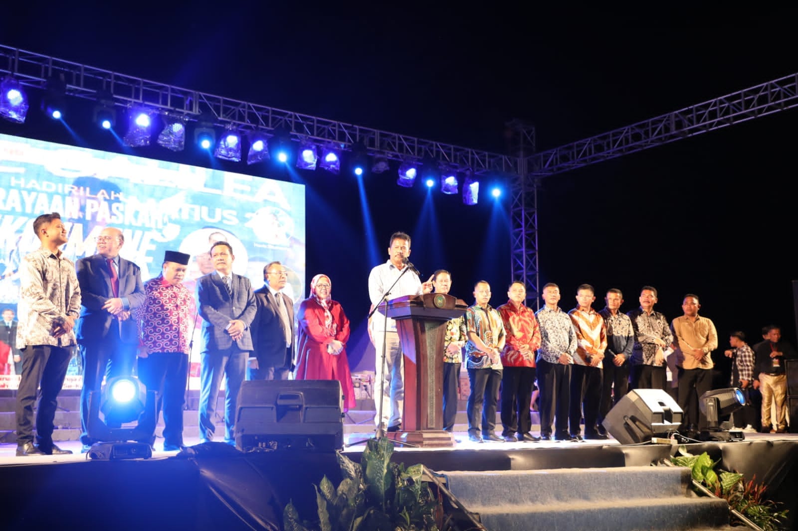 WAGUB Marlin, bersama Wali Kota Batam/Kepala BP Batam H Muhammad Rudi (HMR), memberi sambutan di sela menghadiri Paskah Oikumene se-Kota Batam, di Stadion Temenggung Abul Jamal, Mukakuning, Sabtu (13/5/2023) malam.
