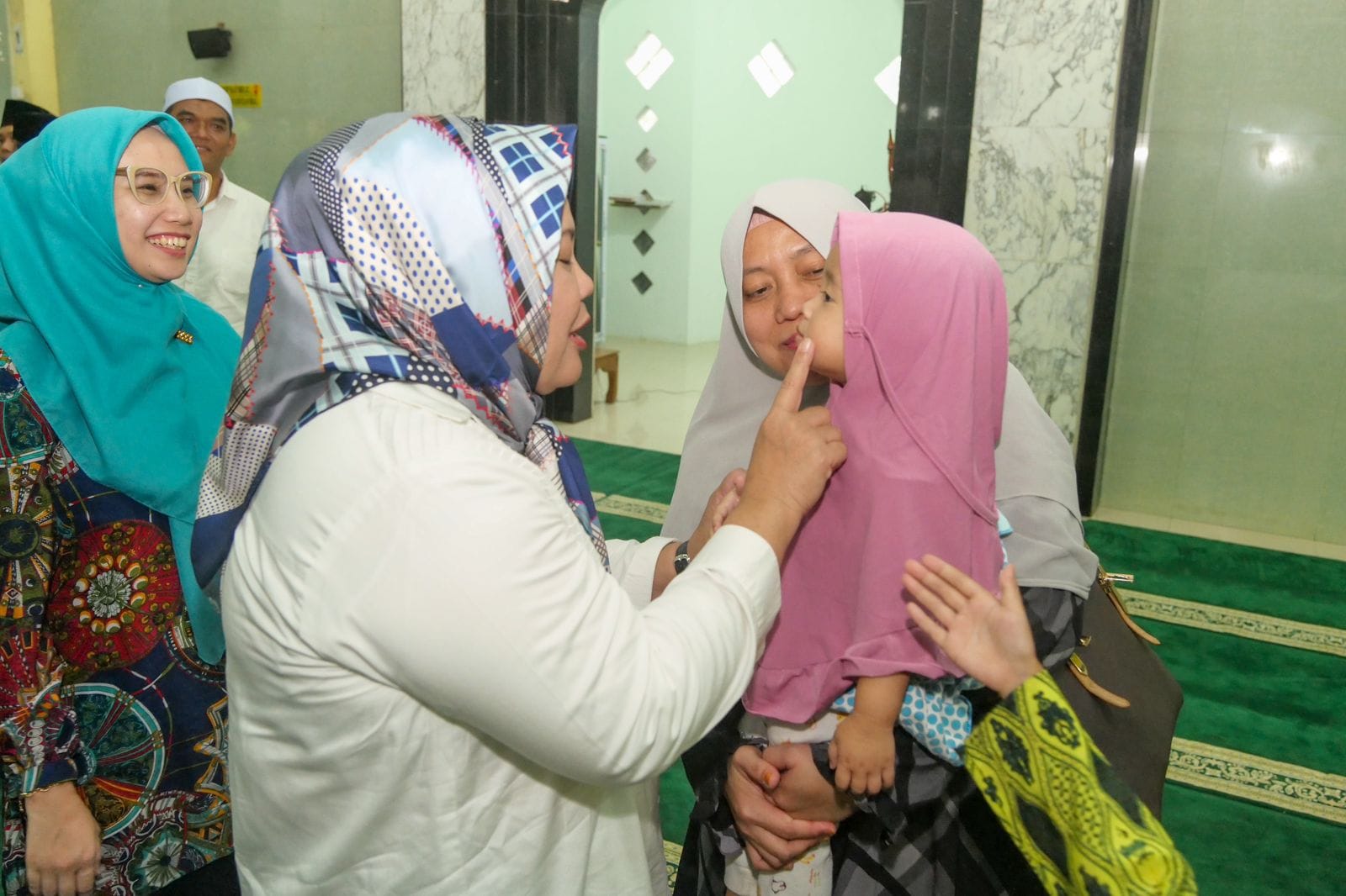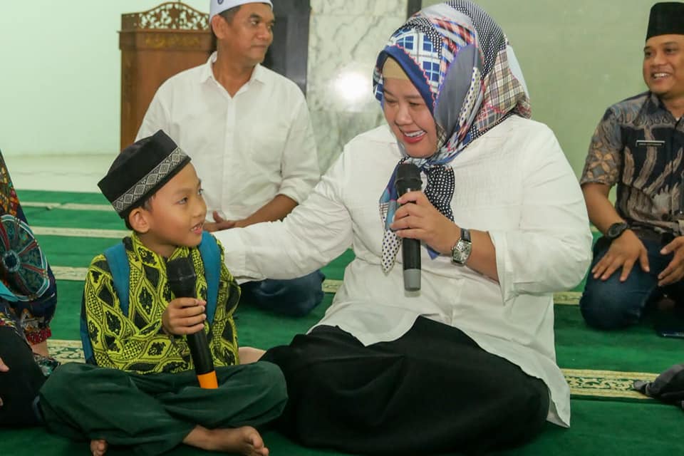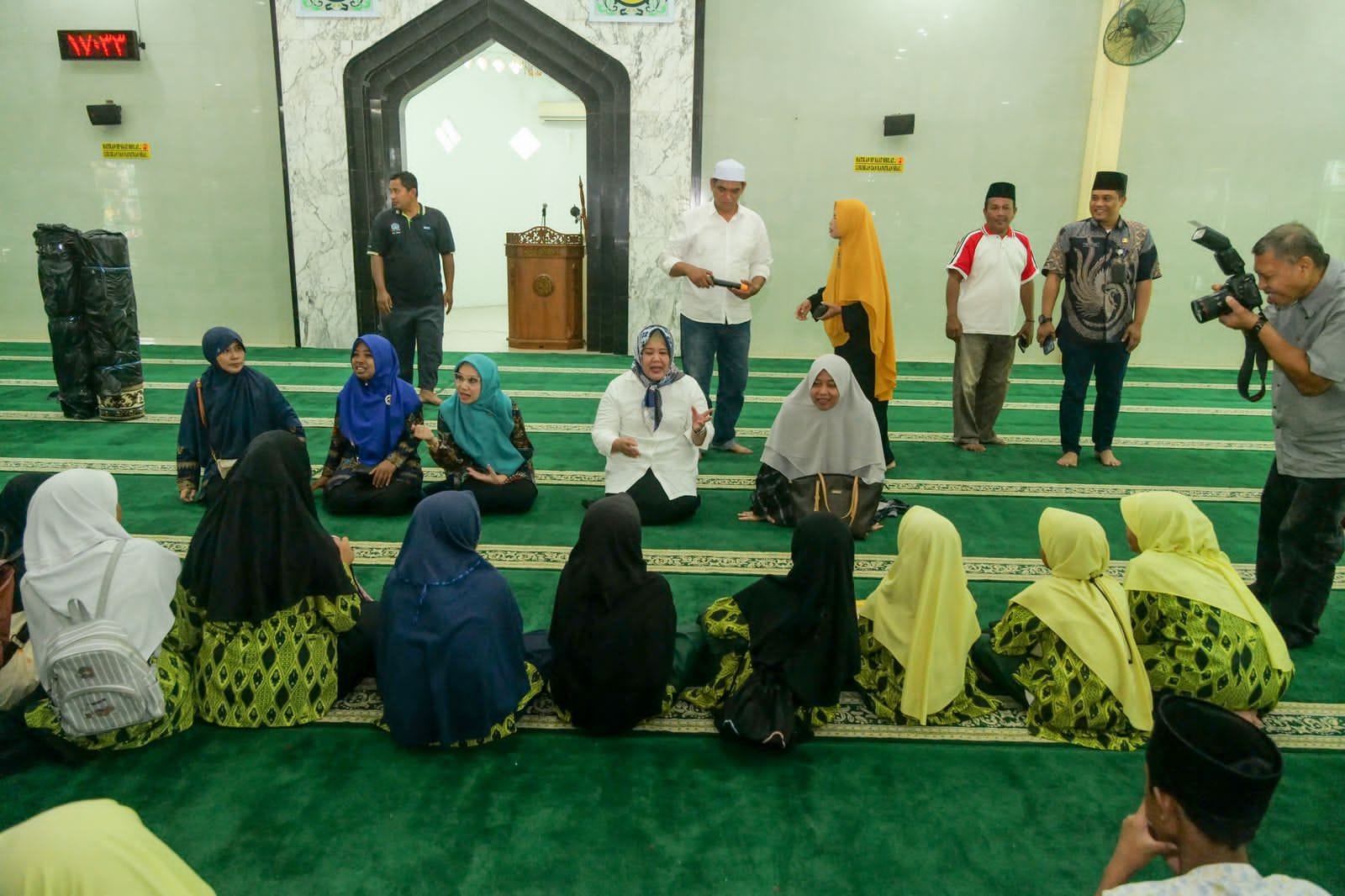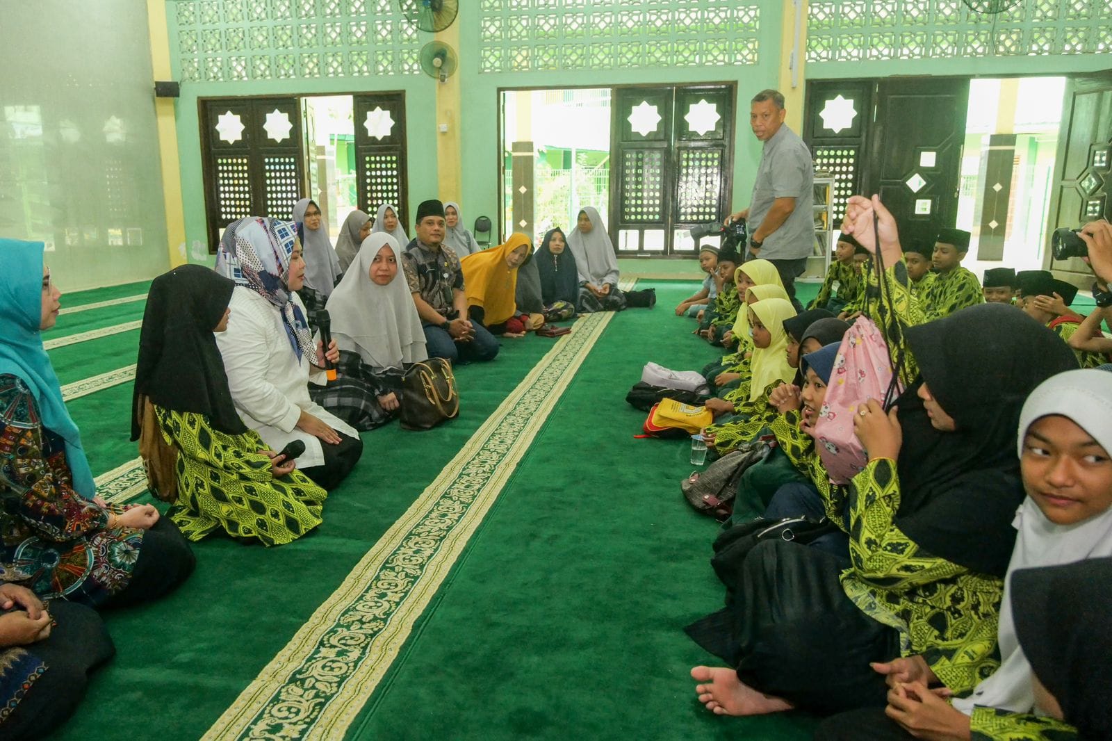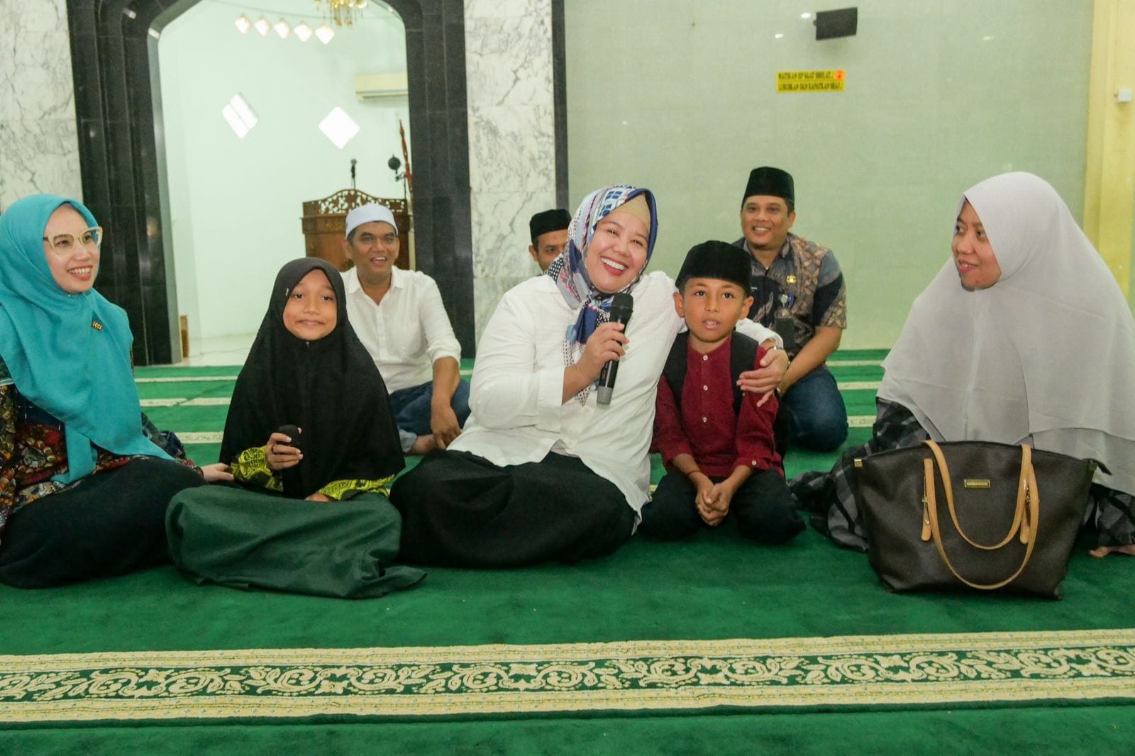WAGUB Marlin, berbincang dengan anak-anak di Masjid Al Mujahidin GMP Tanjungpiayu, di sela rangkaian Road Show Pembinaan Akhlak Mulia TP-PKK Kota Batam, Kamis (9/2/2023) petang.