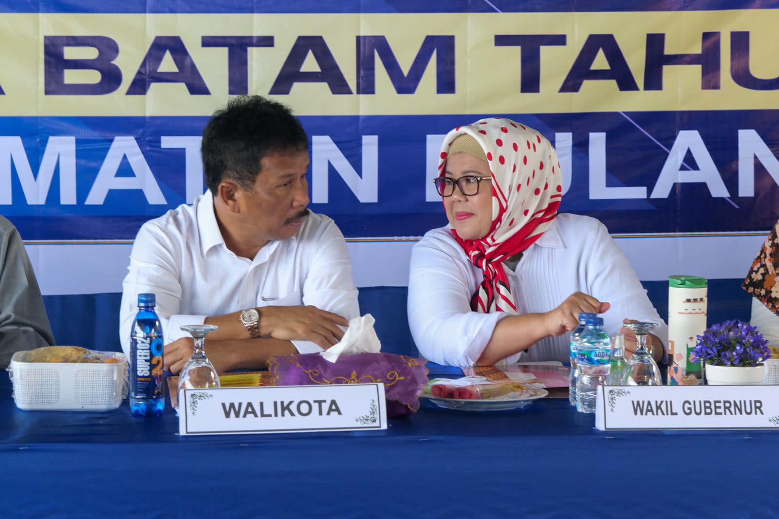 WAGUB Marlin, berdiskusi dengan Wali Kota Batam H Muhammad Rudi (HMR), saat menghadiri Musrenbang Kecamatan Bulang, di Nipah Island Resort, Jembatan II Barelang, Rabu (8/2/2023).