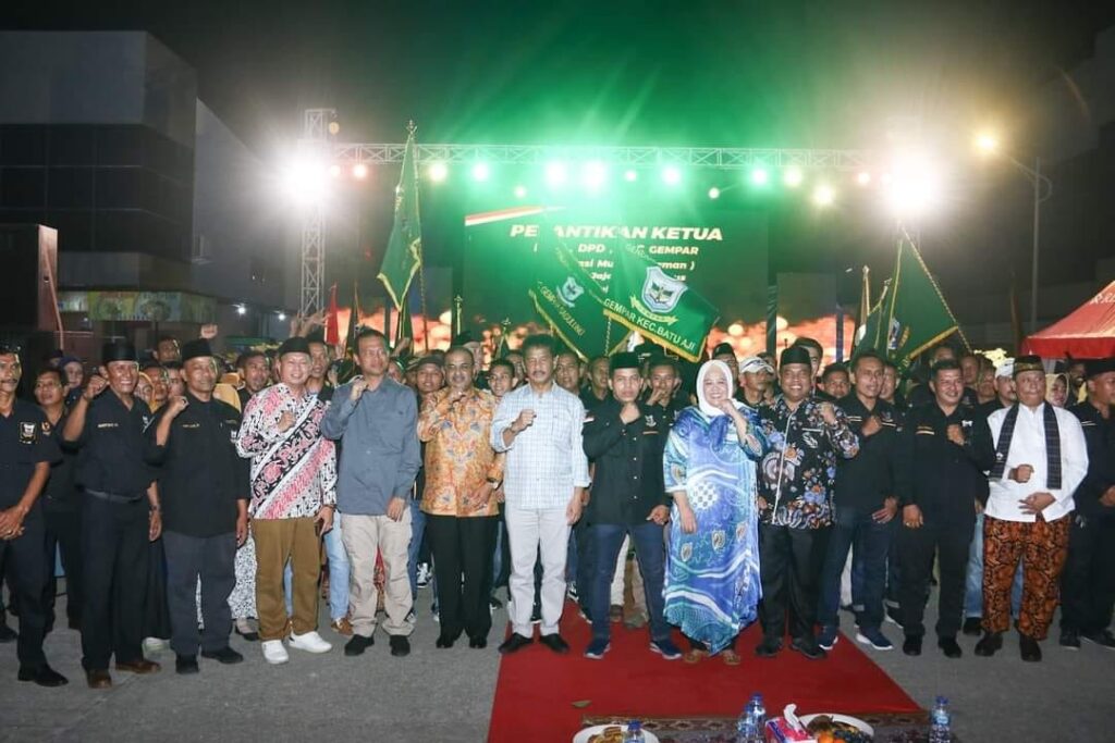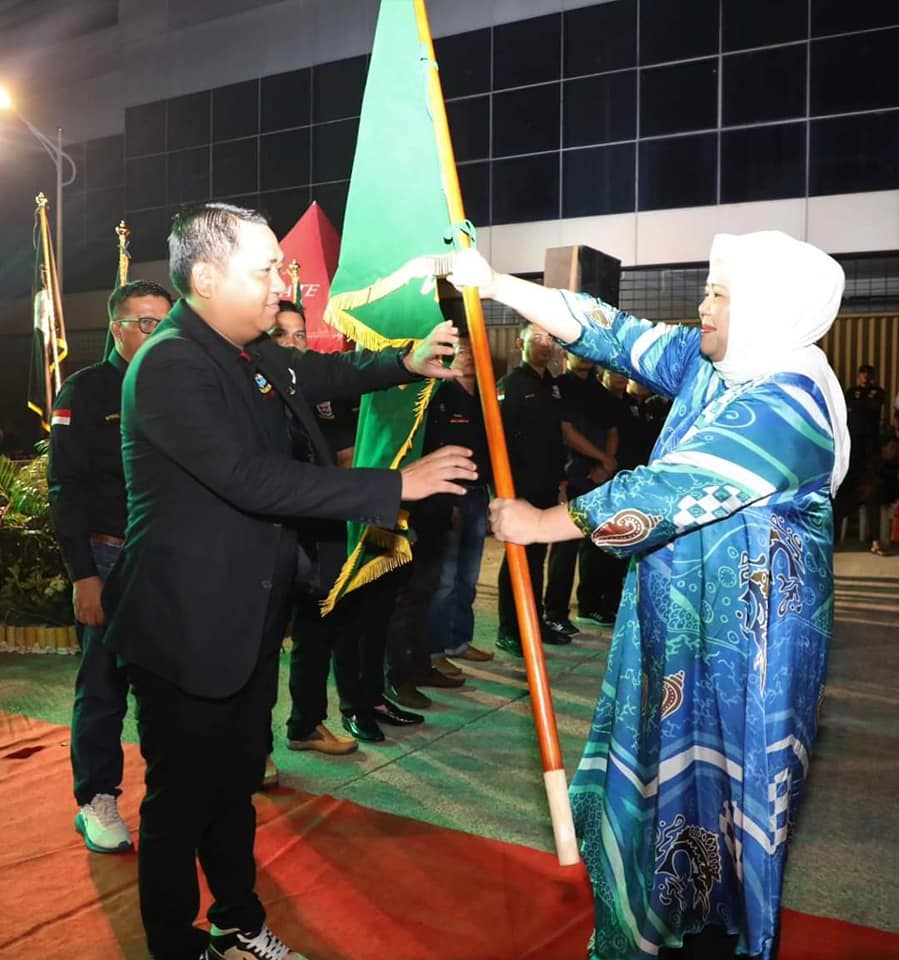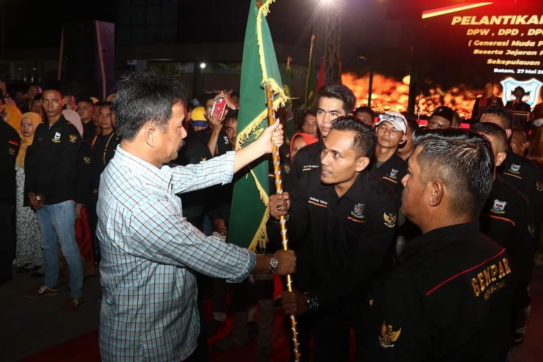 WAGUB Marlin, menyerahkan pataka di sela menghadiri pelantikan DPW Gempar Kepri, sekaligus pengukuhan DPD dan DPC di 7 kabupaten/kota yang ada di Provinsi Kepri, di Mall Botania 2, Batamcentre, Sabtu (28/5/2023) malam.