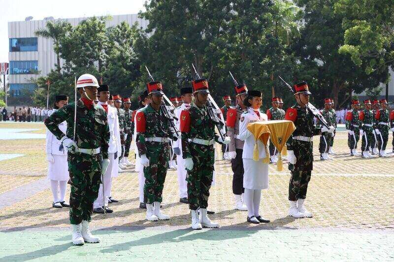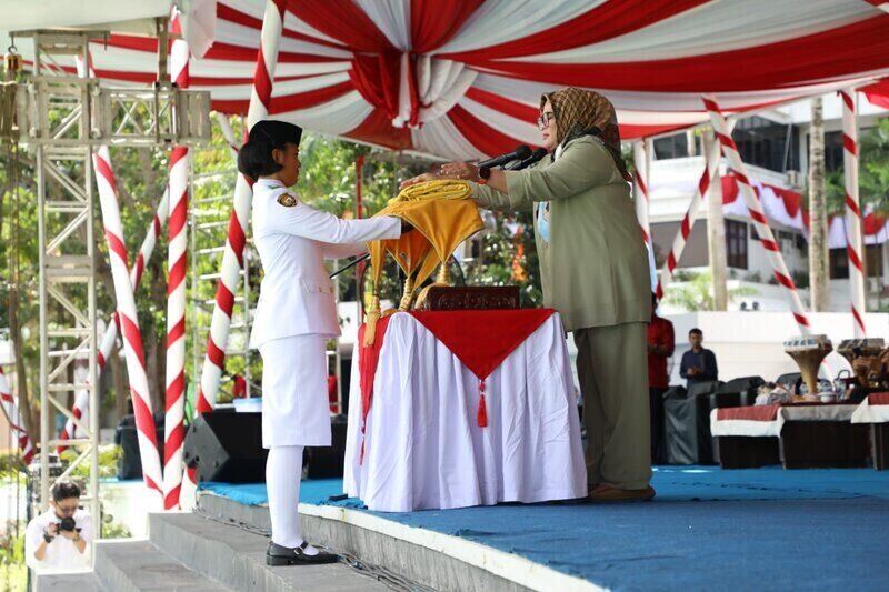 Selaku Inspektur Upacara, Marlin menyerahkan bendera pusaka kepada pembawa baki, Manuella Gracia yang bertugas saat geladi bersih.