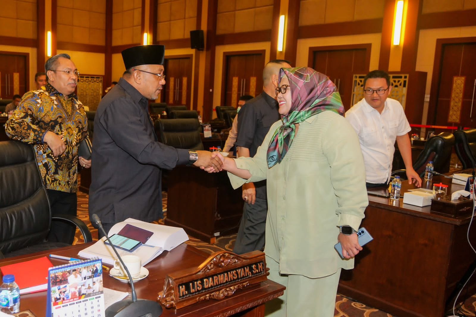 WAGUB Marlin, berjabat tangan dengan anggota DPRD Kepri Lis Darmansyah, di sela acara pembacaan LKPj Kepala Daerah Kepri, Tahun 2022, di Aula Wan Seri Beni, Pulau Dompak, Tanjungpinang, Selasa (21/3/2023).