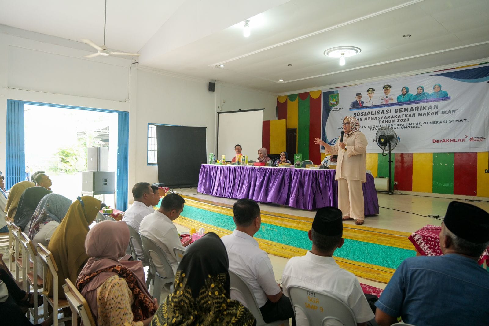 SAGULUNG, KataBatam- Wakil Gubernur Kepulauan Riau Hj Marlin Agustina, menghadiri Sosialisasi Gerakan Memasyarakatkan Makan Ikan (Gemarikan), di Aula SMPN 9 Kecamatan Sagulung, Kota Batam, Rabu (8/4/2023) petang.