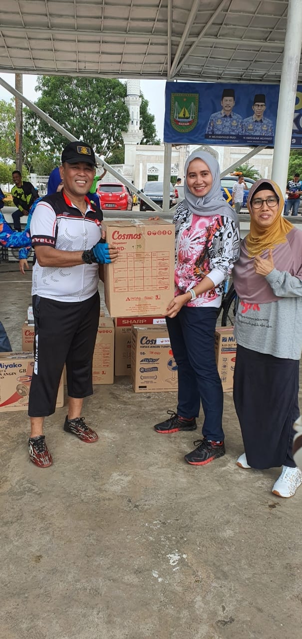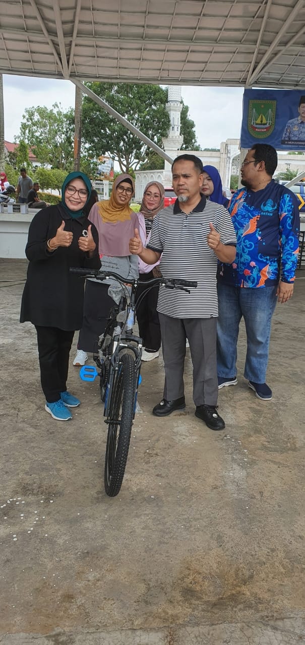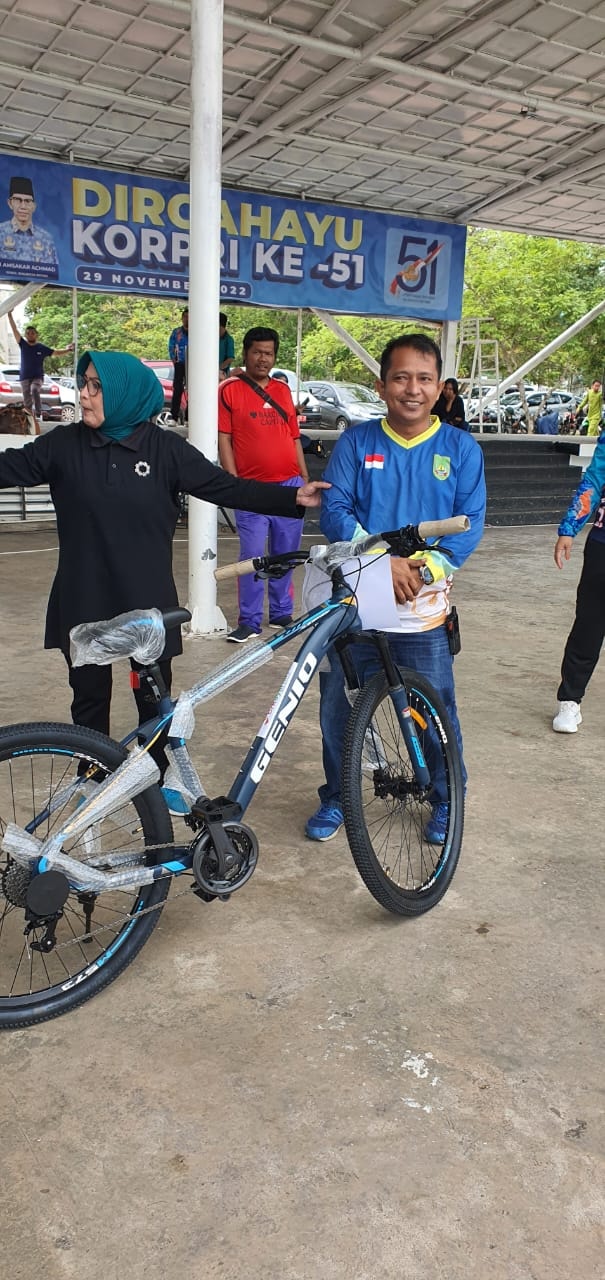 KETUA DWP Kota Batam H Hariyanti Jefridin, menyerahkan hadiah sepeda kepada ASN Pemko Batam yang beruntung, di sela acara Zumba dan Senam Bersama, HUT Ke-51 KORPRI Tingkat Kota Batam, di dataran Engku Putri Batam, Batamcentre, Jumat (2/12/2022).