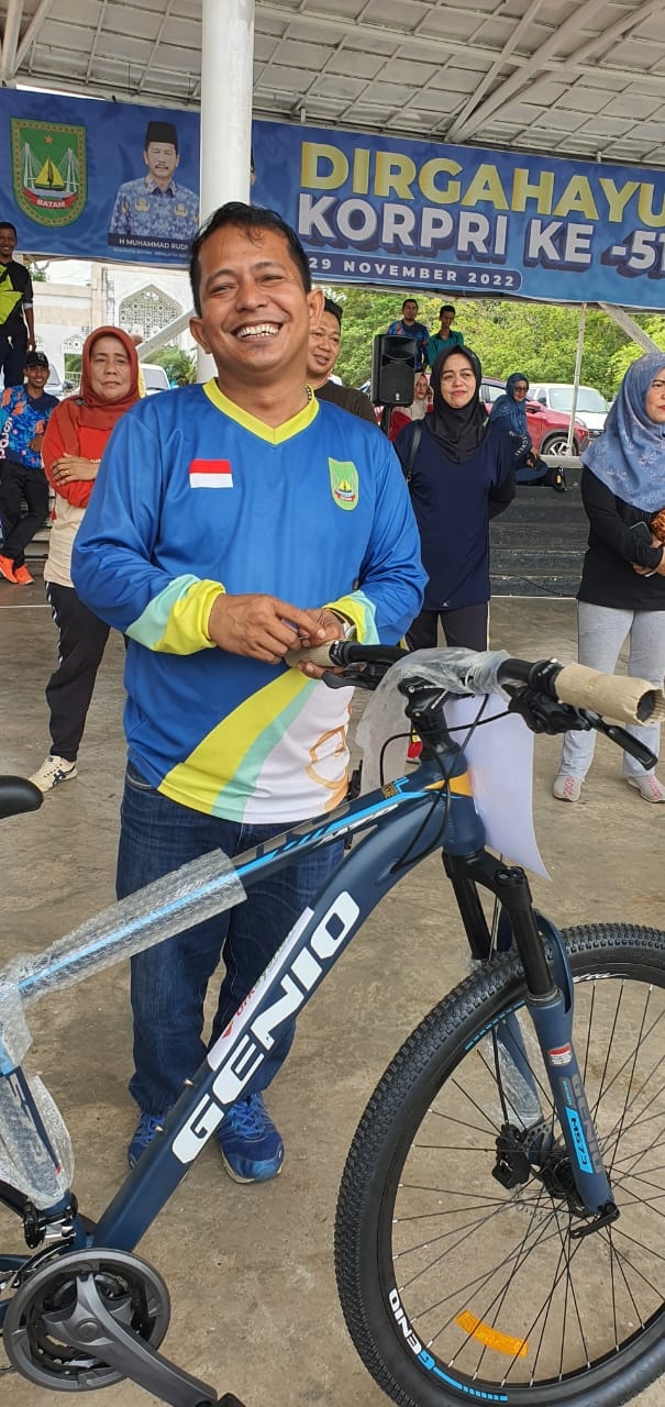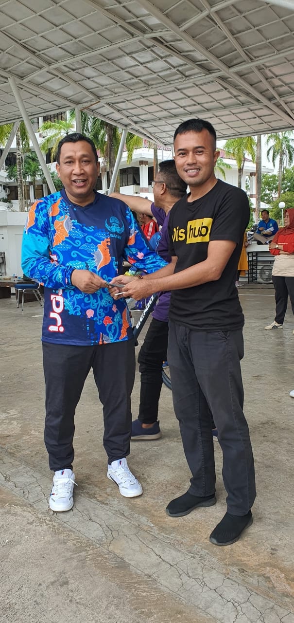 KEPALA Dinas Lingkungan Hidup Kota Batam Herman Rozie, menyerahkan hadiah kepada ASN Pemko Batam yang beruntung, di sela acara Zumba dan Senam Bersama, HUT Ke-51 KORPRI Tingkat Kota Batam, di dataran Engku Putri Batam, Batamcentre, Jumat (2/12/2022).