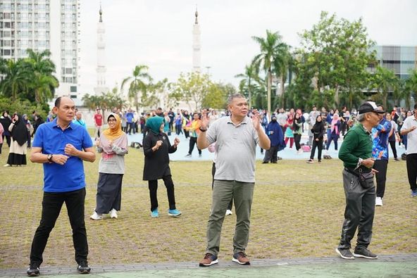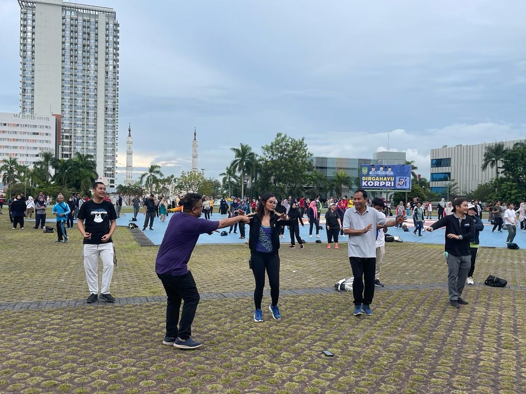 KETUA KORPRI Kota Batam Yusfa Hendri, bersama Kepala Dinas Perumahan Rakyat, Permukiman dan Pertamanan Kota Batam Eryudhi Apriadi, tampak semangat mengikuti gerakan Zumba dan Senam Bersama, HUT Ke-51 KORPRI Tingkat Kota Batam, di dataran Engku Putri Batam, Batamcentre, Jumat (2/12/2022).