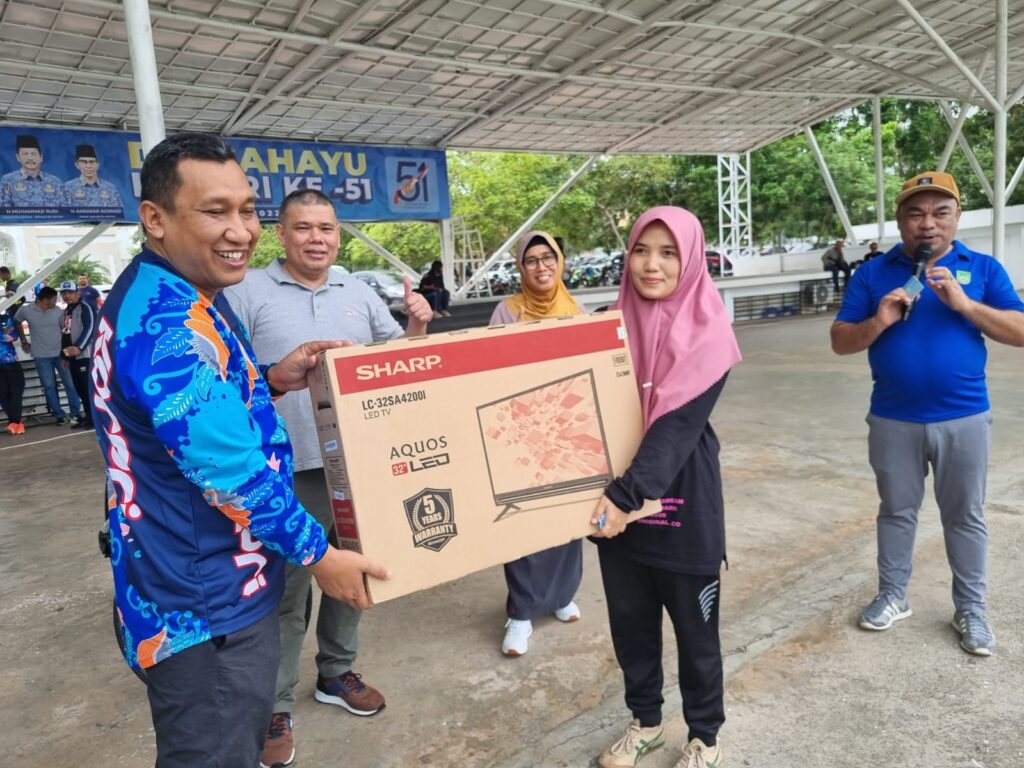KEPALA Dinas Lingkungan Hidup Kota Batam Herman Rozie, menyerahkan hadiah televisi kepada ASN Pemko Batam yang beruntung, di sela acara Zumba dan Senam Bersama, HUT Ke-51 KORPRI Tingkat Kota Batam, di dataran Engku Putri Batam, Batamcentre, Jumat (2/12/2022).