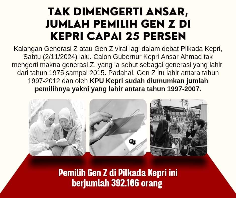 Kebanyakan gen Z merupakan pemilih pemula dalam Pilgub Kepri kali ini. Menurut KPU, pemilih gen Z ini berjumlah 392.106 orang atau mencapai 25 persen dari keseluruhan jumlah pemilih Kepri yang mencapai 1.559.727 orang.